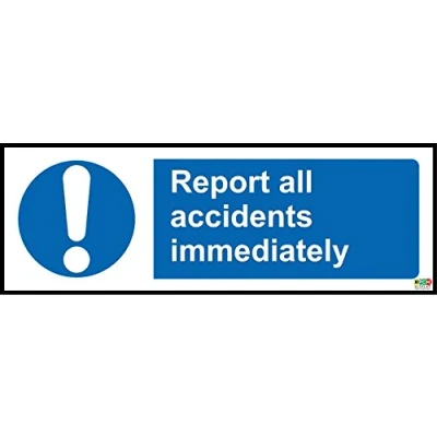 Report all accidents immediately safety sign Self adhesive sticker 150mm x 50mm Remove backing film and apply to dry, smooth, oil free surface. Digitally printed and laminated for extra durabillity