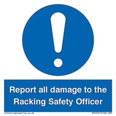 M001 : General mandatory action This sign is made from vinyl high tack A stickier sticker. Uses a stronger adhesive to make it more suitable for plastic surfaces like Wheelie Bins or where the sticker might get rubbed. S85 square Sign Text: Report all damage to the Racking Safety Officer