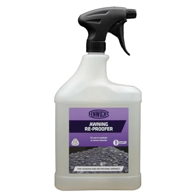 AmazonFenwicks awning and tent re-proofer Easy use on all synthetic & cotton materials Effectively waterproofs awning and tent surfaces Water based, solvent free Comes in a 1 litre trigger spray bottle Awning & Tent Reprooofer 1L Great Product Packaging may vary