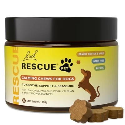 TRUSTED BY PET LOVERS WORLDWIDE – From the makers of Rescue Remedy, the emotional wellbeing brand trusted for generations, now available in calming dog chews. STRESS & SEPARATION ANXIETY SUPPORT – Helps soothe and reassure dogs during stressful moments such as fireworks, travel, storms, separation, or vet visits. EASE NERVOUSNESS & EXCITABILITY – Supports calm behaviour and helps pets feel more settled in challenging situations. DELICIOUS GRAIN-FREE SOFT CHEWS - A tasty peanut butter & apple flavour your dog will love. Convenient daily calming support. CONTAINS BACH FLOWER ESSENCES & CALMING HERBS - Gentle, grain-free formula with Camomile, Valerian and Passionflower, combined with Dr Bach’s original Rescue Remedy flower essences. EASY TO USE – for dogs & puppies 8 weeks +. Dogs 20kg 3 chews per serving. Feed as a snack between meals. TRUSTED BY PET LOVERS WORLDWIDE – calming support for your dog