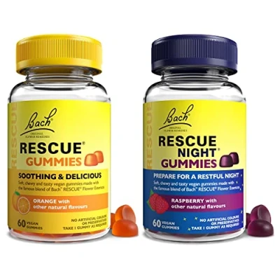 Enjoy soft, chewy and tasty vegan gummies made with the famous blend of Bach RESCUE Flower Essences Variety bundle contains 1 pack of Orange for balanced days and 1 pack of Berry for a restful nights sleep Tasty orange and berry flavour with no artificial colours or preservatives Easy-to-chew gummy for those on-the-go moments From the UK’s no.1 Emotional Wellbeing Brand RESCUE