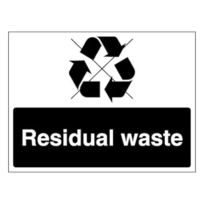 Residual Waste — landscape sign with waste symbol that clearly separates non-recyclables from recycling, cutting contamination and rejected loads. Built to support the UK Simpler Recycling rollout so bin labelling stays consistent across sites and collections run more smoothly. Wide landscape layout reads quickly along corridors and bin banks; ideal at points of disposal where decisions are made in seconds. High-visibility artwork with long-wear, fade-resistant print for dependable legibility indoors or out; available in multiple sizes and materials. 3mm Aluminium Composite – Tough, rustproof, and ideal for long-term indoor and outdoor use.