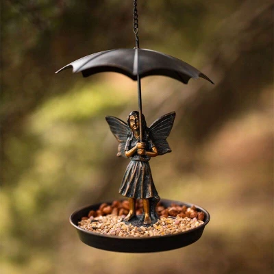 General description Welcome this adorable fairy bird feeder into your outdoor space, and watch as nearby feathered friends quickly make your garden the place to be! This charming feeder features a resin fairy at the center, holding an umbrella to shield herself and visiting birds from the elements. It has ample space for feed and seed, along with a handy edge for birds to easily perch on. Not only does it serve as a bird feeder, but it also acts as a beautiful garden décor piece, making it a perfect gift for any bird lover or a delightful addition to your own outdoor space. Technical specifications Material: Metal and resin Dimensions: H 24 cm x W 16 cm Length of chain: 12 cm Width of inside feeder tray: 14 cm Width of top of umbrella: 18 cm Weight: Lightweight yet durable Compatibility and accessories Includes a hanging hook attached to a strong metal chain for easy installation Installation Easy to hang from trees, bushes, or any hanging hook on walls or fences Usage Simply fill