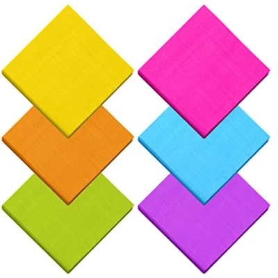 Package includes: comes with 120 pieces of 2-ply paper cocktail beverage napkins in 6 assorted colors, including green, blue, orange, rose red, purple and yellow, abundant quality and color choices to meet your multiple purposes Size: each piece of paper napkin measures approx. 10 x 10 inches when unfolded and 5 x 5 inches when folded Material: these disposable napkins are made of high-quality paper, with 2 layers and high degree of finish, thick and durable These colorful napkins are good party favors and decorations, suitable for catering, food service, fiestas, parties, celebrations, cocktail evenings, luncheons, buffets and daily use Make your parties attractive with these colorful paper napkins, ideal for serving cocktails, appetizers, desserts, or cleaning up messes, good party helpers to you