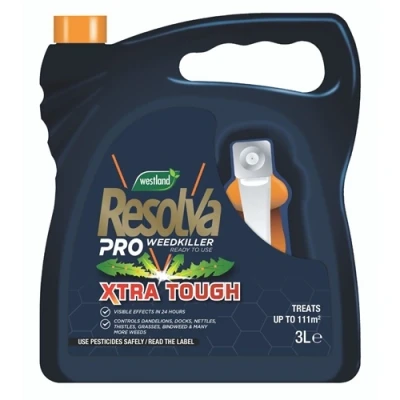 Resolva Pro Xtra Tough Weedkiller is a ready to use systemic weedkiller ideal for controlling annual and deep-rooted perennial weeds. It delivers effective and quick results even on tough weeds, so they don't come back. Resolva Pro Xtra Tough controls a wide spectrum of annual and deep rooted perennial weeds including grasses, Docks, Thistles, Nettles, Dandelions, Bindweed and many more.Controls annual and deep rooted weedsSystemic action kills the rootsVisible effects in 24 hoursBrakes down naturally in the soilCovers large areasCoverage:Up to 111m²How to Use:Always read the label fully before use.For use on unwanted vegetation on bed, borders, path, patios, driveways and around trees.DO NOT SPRAY HEDGE BOTTOMS. DO NOT apply to lawns or other unwanted plants unless you intend to kill them.Use on a calm day when weeds are actively growing & have a large leaf area to absorb the weedkiller spray.Shake well before use. Prepare the sprayer for use: 1. Remove sprayer trigger and unwrap hose 2. Remove cap security seal 3. Open the cap and insert plug attached to the hose end into the bottle neck 4. Turn sprayer nozzle to required sprayer pattern.Spray the weed leaves lightly until fully wetted but avoid run off, taking care to avoid drift to neighbouring vegetation.Rotate spray adjuster to ‘X’ position after use and before storage.Do not walk into treated areas until the spray has dried. Leave weeds for 7 days before cultivating.Safety Information:Always read the product label before use. For full safety information please see the product Safety Data Sheet (SDS).Do not get in eyes. Wash hands and exposed skin before meals and after use. Wash splashes off immediatelyDo not contaminate water with the product or its container. Do not empty into drains.Keep product away from children and pets. Keep away from food, drink and animal feeding stuff.Keep product in original container, tightly closed, in a safe placeContains 1,2-benzisothiazol-3(2H)-one sodium salt. May produce an allergic reaction.Use plant protection products safely. Always read the label and product information before useTo avoid risks to human health and the environment, comply with the instructions for use.Technical Specification:Product Type: Hose end SprayerPack Size: 3LDimensions: Length: 109mm x Height: 266mmWeight: 3.039Kg