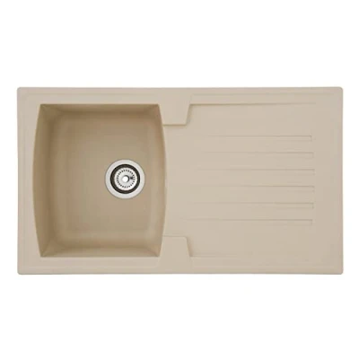 High quality: the Mineralite sink is a perfect addition to any kitchen thanks to the large draining board and its large sink. With a dimensions of 86 x 50 cm, it fits perfectly MINERALITE: Mineralite kitchen sinks are durable and temperature resistant up to 180 °C. The easy-care material of the sink is easy to clean and resistant to stains and bumps Installation: the built-in sink is intended for base cabinets from a width of 45 cm and can be installed on either side of the right or left. The tap holes of the sink are not punctured Box contents: in addition to the kitchen sink in sand beige, drain and overflow set, as well as a strainer basket are included. Fixing clamps are also included for installing the sink International products have separate terms, are sold from abroad and may differ from local products, including fit, age ratings, and language of product, labeling or instructions.