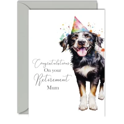 Make them smile with this special retirement card - This exceptional quality retirement card for Her shows the design Party Dog saying 'Congratulations n your retirement Mum'. If you are looking for awesome congratulations greetings cards for Women or retirement card for Her then then this good luck card is bound to make them smile. This could also be a retirement gifts for Mum What's Inside - Print showcasing a lovely verse, 'Wishing you a very Happy Retirement from us all' as seen in the second image. There's ample space for your own personal message. Crafted on a 360-micron thick, environmentally responsible board, this one-sided gloss board offers a luxurious look and feel. Paired with a colored gummed envelope that complements the design, it's ready to be sealed and sent, making it a truly special birthday gesture. Ink Perfection: Say goodbye to ink smudges! Our high-quality one-sided coated board ensures a smooth writing experience without the worry of smudging. The uncoated side absorbs ink, providing a flawless finish that adds to the card's overall premium quality.Mum retirement cards, Mum retirement card, Women retirement card. retirement card for Mum, Female good luck cards. Dimensions that Impress: Greet with grandeur using a card sized at 127mm x 178mm, accompanied by an envelope measuring 130mm x 180mm. The card boasts a thickness of 360 microns, ensuring a substantial and impressive presence. Mum retirement cards from Son or Daughter Great Mum retirement card, retirement cards for Mum, retirement card Mum. British Craftsmanship: Proudly crafted and quality-checked in the UK, our birthday cards are a testament to expert design and manufacturing. Utilizing Forest Stewardship Council certified board, we contribute to responsible forest management. Expect a swift turnaround and a product that reflects the highest standards of quality. Son Daughter retirement cards, brilliant Female retirement cards.