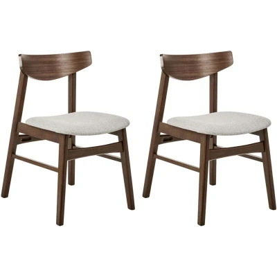 Retro Dining Room Chair Set. Bring timeless elegance to your space with this set of two chairs. Featuring a sturdy natural rubberwood base with visible wood knots, they combine durability with rustic charm. The seats are upholstered in durable fabric, ensuring both style and comfort. Perfect for dining or as accent pieces, these chairs add a classic touch to any room while offering practical functionality. Details: Product Type: Dining Chair Style: Minimalist General Color: Brown, Grey Shade: Light Grey Material Type: Wood Main Material: Rubberwood Additional Material: Fabric Legs material: Wood Seat Material: Fabric Material Composition: 100% Polyester Armrests: No Finish: Lacquered Stackable: No Dimensions: Depth: 52 cm Seat Height: 45 cm Width: 48 cm Height: 75 cm Seating Surface: 46x42 cm Weight: 5 kg Weight Capacity: 120 kg Offer Includes: 2 x Chair Key Features: Firm and Comfortable Seating, Well-Suited for Variety of Home Decor, Traditional Design with a Modern Touch, High