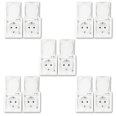 The double socket has two white hinged lids, which protect against moisture. Ideal for the use of IPx4 angled plugs outdoors In the housing there are already cut-outs at the top and bottom through which a cable can be routed. A rubber seal protects the interior from dust and moisture Box contents: 5x double socket for wet rooms and multilingual assembly instructions (English language not guaranteed) Technical details of the wet room socket: maximum load 3680W, 230V~/50Hz, 16A. With protective conductor. Colour: white Double socket dimensions (L x W x H): 78 x 138 x 55 mm. Weight: 172 g, Weight: 0.3858089585 pounds, Manufacturer: REV Ritter GmbH