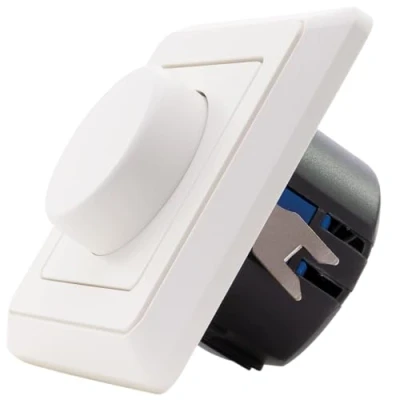 The brightness controller (phase section rotary brightness controller) dims the lamps by turning the controller. The dimmer can be switched on or off by pressing the control The following third-party manufacturers are compatible with BUSCH JAEGER Alpha Nea, Reflex SI, Solo, Duro 2000, Balance SI. GIRA area switch, standard 55. JUNG A500, AS500, CD500 and MERTEN system M The dimmer switch is suitable for dimmable LED lamps, incandescent lamps, high-voltage halogen lamps as well as dimmable energy-saving lamps and low-voltage halogen lamps on electronic transformers Load types incandescent lamps 25-300W, LED dimmable 5-100W, NV halogen lamps on transformer 20-300VA. F2AH/250V~ fuse Dimmer nominal voltage 230V~, 50Hz. Delivery includes frame, assembly instructions and adapters for third-party manufacturers. dimensions (LxWxH) 85 x 85 x 60, weight 85g Further information on suitable lamps can be found on this offer page below under “Product Guides and Documents” Note Before replacing the fuse, de-energize the device. Replace a faulty fuse only with a new fuse of the same type and the same values.