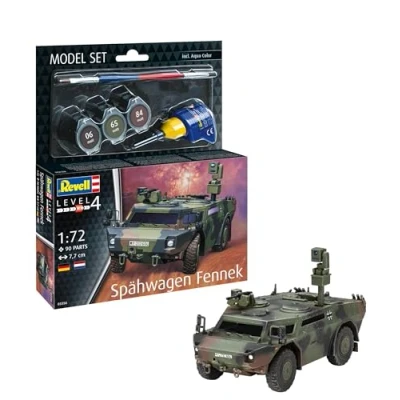 Fennek armored reconnaissance vehicle in 1:72 scale. Experience a fascinating challenge with our model kit of the Fennek armored reconnaissance vehicle in 1:72 scale. This detailed kit, consisting of 90 precisely manufactured parts, brings the most modern reconnaissance vehicle in its class to your home in miniature format. With a length of 77 mm, a width of 34 mm and a height of 25 mm, this model is a true work of art in miniature. It conveys an authentic building experience and at the same time brings you closer to the history and technology of the Fennek., Manufacturer: Carrera Revell Europe GmbH