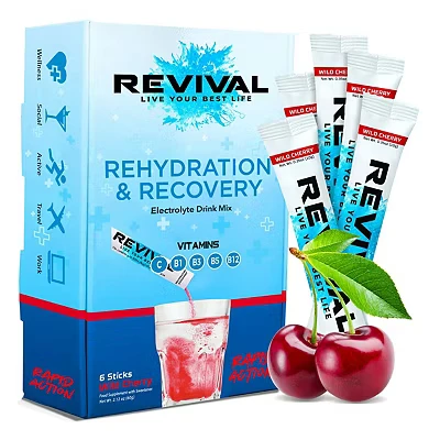 Revival Rapid Rehydration Electrolytes Powder High Strength Vitamin C, B1, B3, B5, B12 Sachet Drink, Electrolyte Hydration Tablets 6 Pack Cherry