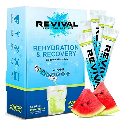 Revival Rapid Rehydration Electrolytes Powder High Strength Vitamin C, B1, B3, B5, B12 Supplement Sachet Drink, Effervescent Electrolyte Hydration Tablets 12 Pack Watermelon