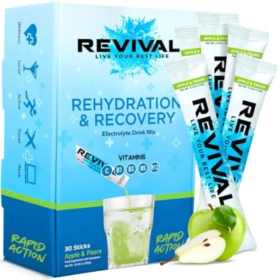 Revival Rapid Rehydration Electrolytes Powder High Strength Vitamin C, B1, B3, B5, B12 Supplement Sachet Drink, Effervescent Electrolyte Hydration Tablets 30 Pack Apple Pear