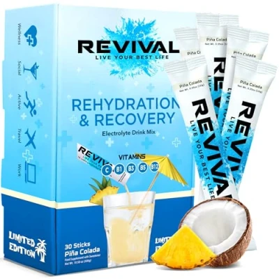 Revival Rapid Rehydration, Electrolytes Powder High Strength Vitamin C, B1, B3, B5, B12 Supplement Sachet Drink, Effervescent Electrolyte Hydration Tablets 30 Pack Pina Colada