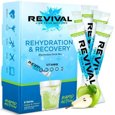 Revival Rapid Rehydration, Electrolytes Powder High Strength Vitamin C, B1, B3, B5, B12 Supplement Sachet Drink, Effervescent Electrolyte Hydration Tablets 6 Pack Apple Pear