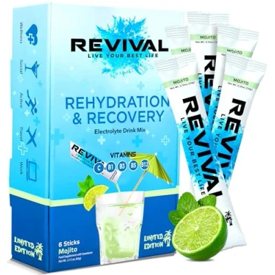 Revival Rapid Rehydration, Electrolytes Powder High Strength Vitamin C, B1, B3, B5, B12 Supplement Sachet Drink, Effervescent Electrolyte Hydration Tablets 6 Pack Mojito