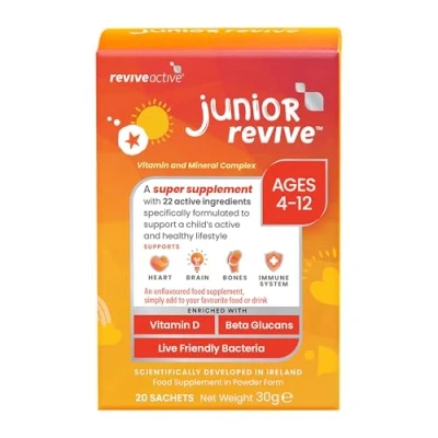 SUPER SUPPLEMENT with 22 Active ingredients including 12 vitamins, 6 minerals, 4 fruit & vegetable powders, Beta Glucans, Fibre, live friendly bacteria and Choline to support a child’s immunity, energy and mental performance all in one daily sachet. HEART HEALTH: Junior Revive contains Thiamine which contributes to the normal function of the heart. BRAIN FUNCTION: Pantothenic Acid contributes to normal mental performance, and Vitamin B6 contributes to the normal function of the nervous system. BONE HEALTH: Manganese and Vitamin K which contribute to the maintenance of bones. IMMUNE SYSTEM FUNCTION: A combination of 8 active ingredients, including Vitamins A, B12, B6, C & D, Folate, Zinc & Selenium all contribute to the normal functioning of the Immune System.