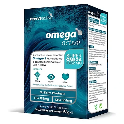 Revive Active Omega Supplement 3 Fish Oil with EPA & DHA, No Fishy Aftertaste Fatty Acids Supplements, Supports Brain, Vision, Heart 60 Capsules