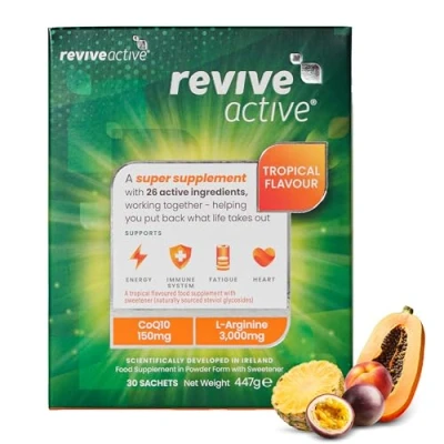 SCIENTIFICALLY DEVELOPED SUPER SUPPLEMENT: Revive Active powder sachets contain a unique formulation of vitamins and minerals combined with other nutrients such as CoQ10 and L-Arginine. NATURAL ENERGY BOOST: Sachets are caffeine and sugar FREE but contain a matrix of 6 different B vitamins which contribute to normal energy yielding metabolism. The Vitamin C and Magnesium also contribute to a reduction of tiredness and fatigue. SUPPORTING HEART & IMMUNE SYSTEM: L-Arginine and Citrulline combine to help the body to create Nitric Oxide as well as Thiamine that contributes to the normal function of the heart. Vitamin D contributes to the normal function of the immune system, and Vitamin C contributes to maintaining the normal function of the immune system during and after intense physical exercise. GET THE MOST FROM YOUR BUSY, ACTIVE LIFESTYLE: Add a sachet to water or juice each morning on an empty stomach. Perfect for anyone with a busy lifestyle, Athletes, Frontline workers or the Active Ageing. FREE FROM: Revive Active products are free from fillers, binders, stimulants, and artificial colours and flavours. Revive Active is also Vegan friendly, Gluten Free, Halal Certified and suitable for diabetics.