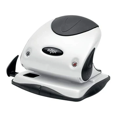 Durable metal 2 hole punch for punching up to 25 sheets (80gsm paper), Ideal for punching papers and documents in the office, at home or at school, Matching products available in the Rexel Choices range Patented Paper Alignment Indicator for accurate punching, Adjustable guide bar with easy-to-view paper size indicator window, Handle locks down for space-saving storage Ergonomic design and soft feel handle for comfortable use, Angled base to make it easier to insert paper, Name plate to clearly identify ownership Easy to empty, hinged confetti tray which is translucent to view contents, Non-slip feet to prevent movement when in use and damage to your desk, 5 year guarantee Contents: 1 x Rexel Choices P225 2 Hole Punch, White, Dimensions: (WxHxD): 14.7 x 16.9 x 6.5 cm, Weight: 590 g, 2115691