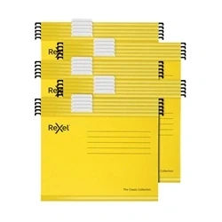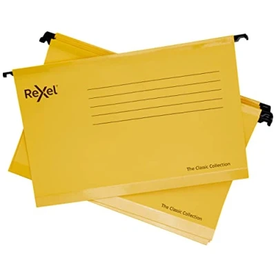 Rexel Classic Foolscap Reinforced Suspension Files for Filing Cabinets, 15 mm V base, 100 Percent Recycled Card, Yellow, Pack of 25, 2115593