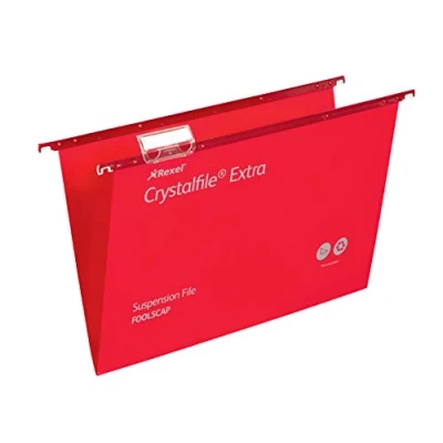 Highly durable Foolscap hanging files providing easy access to frequently used documents, suitable for use in filing cabinets, desk drawer chassis and desk top organisers with rails 387 mm apart Standard capacity, 15 mm V-base holds up to 150 A4 sheets (80 gsm), file dimensions 387 x 240mm, runner length 407 mm Supplied with multi-positionable snap proof Crystal Tabs and unique printable inserts for easy referencing Made from tough polypropylene which typically lasts up to 5 times longer than manila, with a wipe clean satin finish and matching coloured steel runners for colour coded filing Contents: 1 x Pack of 25 Rexel Foolscap Crystalfile Extra 15 mm Polypropylene Suspension Files, Red, 70629, Dimensions (WxHxD): 407x240x15 mm, for hanging on rails 387 mm apart