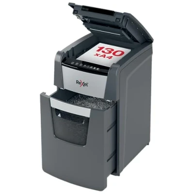 Paper shredder for secure disposal of confidential documents, with autofeed feature for 130 sheets (max), Manual slot for up to 8 sheets (80 gsm), Easy empty 44L capacity pull out bin Suitable for up to A4 size paper, shreds credit cards, staples and paper clips and features anti jam technology for preventing paper jams The 130X has a 30 minute continuous run time with fan cooling, Sleep mode activates after 3 minutes of non use, Touch control panel and infra red bin full sensor Shredding supports GDPR (General Data Protection Regulation) compliance, auto feed shredders ensure this task is easy and efficient, saving 98 percent of time versus manual shredding, For continuous performance oil regularly with Rexel Oil Sheets, 2 year warranty, 2 year cutter warranty Contents: 1 x Rexel Optimum Auto Feed Cross Cut Paper Shredder, capacity: 44 Litre, dimensions, (W x H x D) 365 x 618 x 430 mm, 2020130X