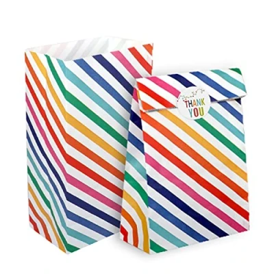 RFWIN 20Pcs Party Bag Kraft Paper Candy Bags, Rainbow Stripe Kids Birthday Bags with Stickers, Gifts Sweets for Baby Shower Wedding Valentines' Day