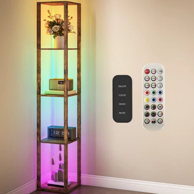 Rgb led Floor Lamp with Shelves and Remote Control, Rustic Brown Homcom