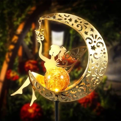 [High Quality Material] These garden fairy lights are made of metal, rustproof and waterproof. It measures 22x6.5x104cm/8.66x2.56x40.95 inches, easy to press into the soil. It is a good choice for your garden, yard, path, or patio decorative lights. [Solar Moon Fairy Lamp] These fairy garden lights are designed with a fairy moon that produces beautiful patterns when illuminated. Outdoor solar lights add charming landscape lighting to your lawn garden backyard or pathway, making your garden more beautiful and charming. [Auto On/Off] These solar fairy lights have a built-in photosensitive element that automatically controls the brightness. After fully charged, it can illuminate for 8 hours at night and turn off automatically at sunrise. Please fully charge it when you receive it. Then you can use it normally. [Perfect Garden Gift] These solar garden lights come in a beautiful box of his design. As a gift for mom/grandma/wife/daughter/sister/aunt/grandma, girlfriend/boyfriend, wife. Perfect for wedding anniversaries, children's birthdays, mom's birthdays, or Mother's Day, Father's Day, Thanksgiving, Valentine's Day, and Christmas. [Easy Installation] These outdoor garden lights are lightweight and easy to install and use. You can put it anywhere. It will automatically light up at night after being fully charged during the day, which is both environmentally friendly and energy-saving. Make sure to turn the switch to the "on" position to let the sunlight shine on the solar panel. Perfect for adding beauty to your garden and patio at night.