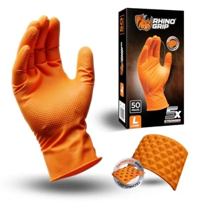 RHINO Grip Nitrile Gloves Disposable Gloves, Diamond Orange Powder Free & Latex Extra Thick Ultra Tough Gloves. Medium