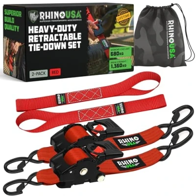 AMERICAN OWNED, FAMILY OPERATED - Join the Rhino USA Family and Support a Father/Son Business With USA-Based Live Phone Support. CHOOSE THE BEST, AVOID THE STRESS - Authentic, High-Quality Retractable Ratchet Straps—Designed and Tested in the USA to Exceed Safety Standards, Ensuring Your Cargo is Secure Without Compromise. INSTANT SELF RETRACTING STRAP - Effortlessly Manage Excess Strap Length with a Simple Click of a Button for Quick and Convenient Use in Any Situation. HIGHEST QUALITY MATERIALS - Equipped with an Anodized Ratchet, an Ergonomic Padded Handle, and Coated Full Bend S-Hooks for Optimal Durability and Comfort During use. INCLUDES (4) SOFT LOOP TIE DOWNS - Ideal for Creating Secure Anchor Points on Roof Racks, Truck Beds, Handlebars, and More, Ensuring a Versatile and Reliable Tie-Down Solution.