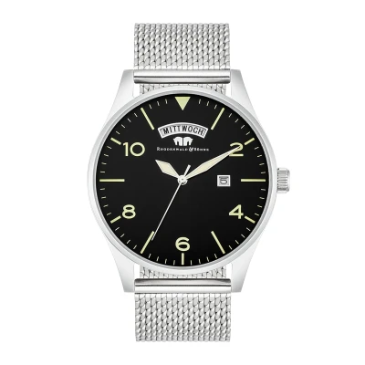 Less is more: According to this motto, the design of this exclusive men's watch was designed by the Rhodenwald & Sons manufactory. Reduced to the date and weekday display and simple line indeed combined with Arabic numerals and feuille devices, the dial convinces with minimalism. Exquisite eye-catcher is the elaborate Milanais bracelet with sliding closure. Behind the classic watch look in the tradition of old watchmaking, modern materials and contemporary technology convince: housings and bracelet are made of robust stainless steel. Hardened mineral glass and a precise quartz train complete the high -quality equipment.