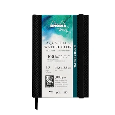 Watercolour BOOK GRAIN FIN : RHODIA TOUCH A6 portrait notebook - 10.5x14.8 cm inner page size RIGID NOTEBOOK: Made in the Netherlands by SHUT, Fontaine 300 gsm, 100% cotton FINE GRAIN watercolour paper is suitable for beginners and professionals alike. RESISTANT: 40-page notebook with resistant paper and excellent absorbency, enabling repentance (the ability to come back to work in progress by erasing a trace of paint). PRACTICAL: Includes a bookmark ribbon for an organized notebook! ICONIC and AUTHENTIC: with its emblematic logo, RHODIA, the brand with two fir trees, has been a guarantee of QUALITY since 1934.