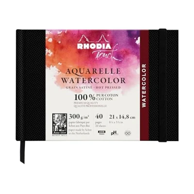 Watercolour BOOK GRAIN SATINÉ: RHODIA TOUCH A5 landscape notebook - 21x14.8 cm interior pages RIGID NOTEBOOK: Made in the Netherlands by SHUT, Fontaine 300 gsm, 100% cotton SATIN GRAIN watercolour paper is suitable for beginners and professionals alike. RESISTANT: 40-page notebook with resistant paper and excellent absorbency, enabling repentance (the ability to come back to work in progress by erasing a trace of paint). PRACTICAL: Includes a bookmark ribbon for an organized notebook! ICONIC and AUTHENTIC: with its emblematic logo, RHODIA, the brand with two fir trees, has been a guarantee of QUALITY since 1934.