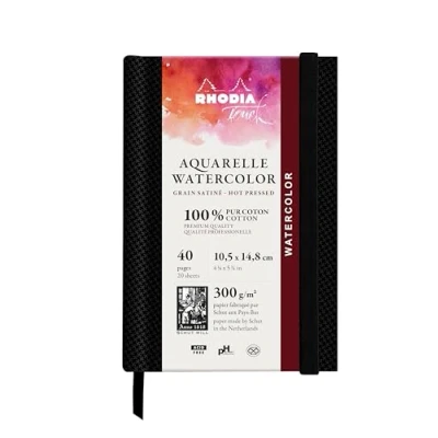 Watercolour BOOK GRAIN SATINÉ : RHODIA TOUCH A6 portrait notebook - 10.5x14.8 cm inner pages size RIGID NOTEBOOK: Made in the Netherlands by SHUT, Fontaine 300 gsm, 100% cotton SATIN GRAIN watercolour paper is suitable for beginners and professionals alike. RESISTANT: 40-page notebook with resistant paper and excellent absorbency, enabling repentance (the ability to come back to work in progress by erasing a trace of paint). PRACTICAL: Includes a bookmark ribbon for an organized notebook! ICONIC and AUTHENTIC: with its emblematic logo, RHODIA, the brand with two fir trees, has been a guarantee of QUALITY since 1934.