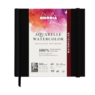 Watercolour BOOK GRAIN SATINÉ : RHODIA TOUCH rigid notebook 15x15 cm inside pages size RIGID NOTEBOOK: Made in the Netherlands by SHUT, Fontaine 300 gsm, 100% cotton SATIN GRAIN watercolour paper is suitable for beginners and professionals alike. RESISTANT: 40-page notebook with resistant paper and excellent absorbency, enabling repentance (the ability to come back to work in progress by erasing a trace of paint). PRACTICAL: Includes a bookmark ribbon for an organized notebook! ICONIC and AUTHENTIC: with its emblematic logo, RHODIA, the brand with two fir trees, has been a guarantee of QUALITY since 1934.