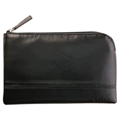 RHODIA 116523C Faux Leather Zipped Pouch Black Size S (11x17 cm) Real Stitching Orange Fabric Interior Storage of Documents, Small Supplies