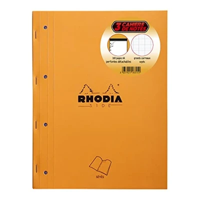 Rhodia 118315C set of 3 stapled blocks on the Side Orange side, A4 (22.3x29.7 cm), 80 detachable pages, 4 hole perforation, large Séyès tiles, white Clairefontaine paper g / m²