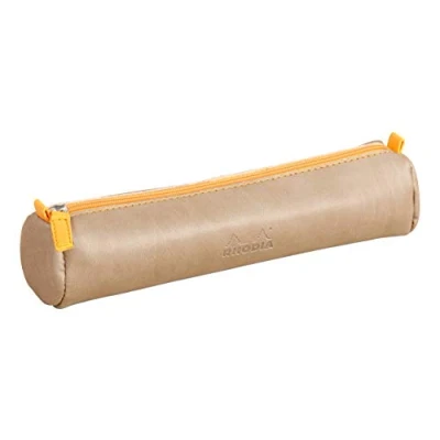 RHODIA 318894C Rhodiarama Taupe Round Pencil Case 21.5 x 5.5 cm Genuine Orange Stitching Ivory Jersey Interior Faux Leather Storage for Pens, Pencils, Markers, Small Supplies
