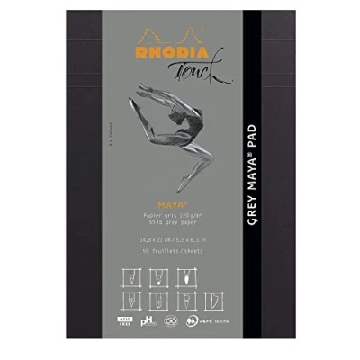 CLAIREFONTAINE MAYA 120 g/m² PAPER: grey, cellulose-based and perfectly smooth on both sides, it lends itself particularly well to PRECISE DRAWING WITH PENCIL, FELT PEN, GRAPH LINER, PEN... Its surface allows quick drying of the ink. VERY RESISTANT, it withstands repeated scratching and scrubbing without fluffing. PLAIN MICROPPERFORATED SHEETS: easily detachable thanks to the header microperforations. STAPLED BLOCK LETTERHEAD wrap-around cover in 270gsm black Maya card, scored to easily fold back. Rhodia Touch logo embossing on the front ECOLOGICAL: PEFC certified paper - products from sustainably managed forests and controlled sources. Acid-free, pH neutral. Made from vegetable glue. Suitable for vegans MADE IN FRANCE: the Rhodia block is THE REFERENCE for stapled blocks. Ultra-functional and refined, all our notepads are made in France, in our factory in Mulhouse in Alsace THE RHODIA TOUCH COLLECTION offers CALLIGRAPHERS, URBAN SKECHERS, DESIGNERS, ARCHITECTS and ILLUSTRATORS relevant notebooks, notebooks and pads specially designed for them. We have always mastered the art of paper. Also, it is because CLAIREFONTAINE BEAUX-ARTS PAPERS are MANUFACTURED IN OUR OWN FACTORIES IN FRANCE AND THE NETHERLANDS, that Rhodia Touch products are destined to be the supports of choice for all lovers of exceptional papers. . This PAPER-MAKING KNOW-HOW, combined with the proven success and flawless reputation of the Clairefontaine brand in the field of fine arts, constitute the precious quality labels of this range. ICONIC and AUTHENTIC: with its emblematic logo, RHODIA, the brand with two fir trees, has been a guarantee of QUALITY since 1934. Heritage and papermaking know-how are embodied in our collections of STATIONERY, ORGANIZATION and STORAGE items with lines refined, both beautiful and FUNCTIONAL, true timeless must-haves