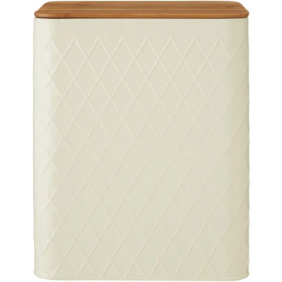 General description The Premier Housewares Rhombus Rectangular Storage Canister is an ideal solution for keeping your kitchen clean and organized. Designed to store various kitchen items such as sweets, biscuits, cookies, flour, sugar, and more, this canister features an airtight lid that ensures the contents remain safe and fresh for an extended period. Its robust metal construction and beautiful embossed lattice pattern provide both durability and aesthetic appeal, making it a perfect addition to your kitchenware. Technical specifications Weight: 1.4 kg Material: Metal Lid Material: Bamboo Usage This versatile storage canister can be used for a variety of purposes, including storing flour, dog food, and pasta. Its ideal size makes it suitable for multiple kitchen items, ensuring that everything is organized and easily accessible. Other information Easy to clean; can be washed with water and dried with a cloth.