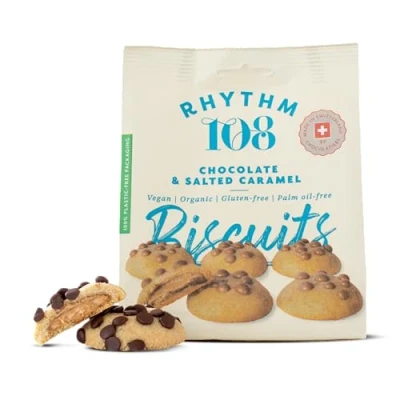 RHYTHM 108 Swiss Vegan Chocolate & Salted Caramel Biscuit Share Bag 135g x 8
