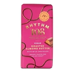 Rhythm 108 Roasted Almond Butter 100g is an organic, gluten-free, and vegan chocolate bar filled with almond cream, containing 25% less sugar than similar products. Made in Switzerland with natural ingredients, it features recyclable packaging and contains almonds and hazelnuts.