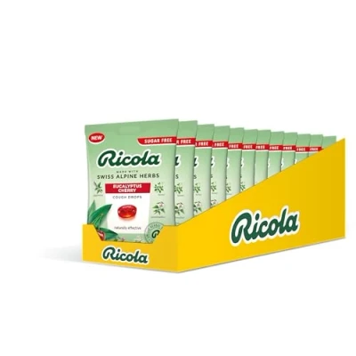 MADE WITH 13 SWISS ALPINE HERBS: Sugar free Ricola Eucalyptus Cherry throat lozenges combine our original 13 Swiss Alpine herbs with mildly aromatic essential eucalyptus oil and the fruity sweetness of ripe Swiss cherries for a throat soothing taste experience NATURALLY EFFECTIVE: Ricola herbs are grown in the Alps where the air is pure and the soil rich. Each throat lozenge is a combination of the herbs and natural ingredients selected selected to help soothe throat and voice. COUGH DROPS: Minor throat irritations can come along at any time of the year; when they do, it’s better to have Ricola cough sweets by your side to bring naturally effective comfort to sore throat. SUGAR FREE: Swetened with Stevia. Suitable for vegetarians and vegans, lactose and gluten free. Made only with natural colours and flavours. DISCOVER THE FLAVOURS : Cough Drops Multipacks of 12 - Honey Lemon and Echinacea, Original, Eucalyptus Cherry