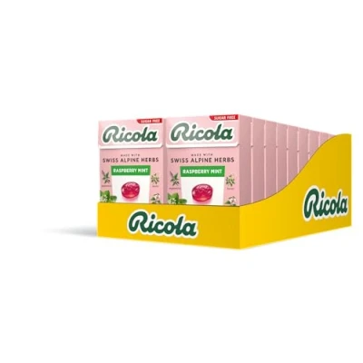 REFRESHING AND FRUITY: Sugar free Ricola Raspberry Mint combines our Original 13 Swiss Alpine herbs with the fruity sweetness of raspberry and aromatic lemon balm for a soothingly refreshing taste experience. SOOTHINGLY GOOD: Our sugar free sweets are a perfect treat whether you’re in the car, on the train, in the office or just taking a moment for yourself - a delicious Ricola sweet box, packed with natural Swiss herbs and fruit flavours, can give you a little boost and refreshement needed to revive your day. MADE WITH 13 SWISS ALPINE HERBS: Ricola herbs are grown in the Alps where the air is pure and the soil rich, Ricola herbs are cultivated by our farming partners. Ricola sugar free herbal sweets combine the fruity juiciness of raspberry with the soothing Swiss Alpine herbs. SWEETENED WITH STEVIA: sugar free herbal sweets. Suitable for vegetarians and vegans, lactose and gluten free, kosher. Made with only natural colours and flavours. DISCOVER THE FLAVOURS : Sweets Multipacks of 10 - Raspberry, Blackcurrant, Liquorice, Glacier Peppermint, Elderflower, Cranberry, Lemon Mint, Rasberry Mint. Sweets Multipacks of 20 - Blackcurrant, Raspberry, Glacier Peppermint, Liquorice, Cranberry, Elderflower, Original, Lemon Mint, Raspberry Mint