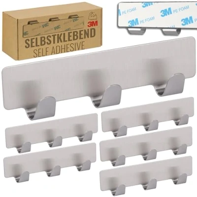 RICOO Premium Self Adhesive Hooks MH020 6, Modern Stainless Steel Wall Mounted Hook Rack with 3 Heavy Duty Set of Stylish and Durable Stick On for Bathroom, Kitchen, More Silver