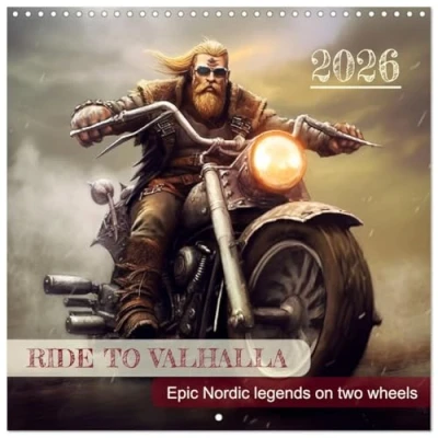 LOTS OF SPACE – Big calendar grid for notes, appointments and to dos. Organising made easy! HANDY – Size closed: 30 x 30 cm, opened: 30 x 60 cm, days in five languages: English, Spanish, French, Portuguese and Italian BEAUTIFUL IMAGES – This planner is not only ideal for planning everyday life but also adorns your home. Perfect also for gifting! WORKS WITH ANY PEN – Use ballpoint pens, pencils or sharpies SUSTAINABLE – Significant waste reduction due to print-on-demand production, environmentally friendly FSC-certified paper, printed in the UK, climate-conscious logistical processes. Epic Nordic legends on two wheels , Author: DigitalDreamweaver - Simone Hug