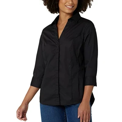 Wrinkle-resistant shirt featuring hidden placket and princess seaming Three-quarter sleeves